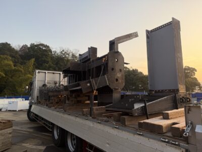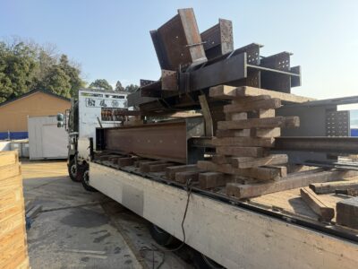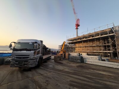 先日、京都府宮津市の現場にて、鉄骨部材の搬入作業を行いました。